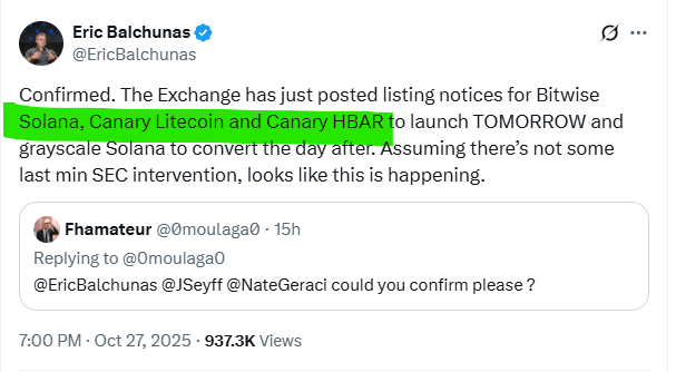 大门刚刚打开。Bitwise $SOL 质押ETF(BSOL),Canary $LTC ETF和Canary $HBAR ETF今天开始交易,这是自现货比特币基金推出以来最大的多资产加密ETF发布。这对数字资产的采用意义重大。