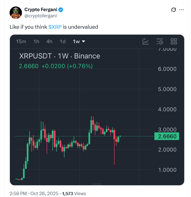 许多交易者,包括Crypto Fergani,都在质疑XRP当前的价格是否真正反映了它的长期潜力。