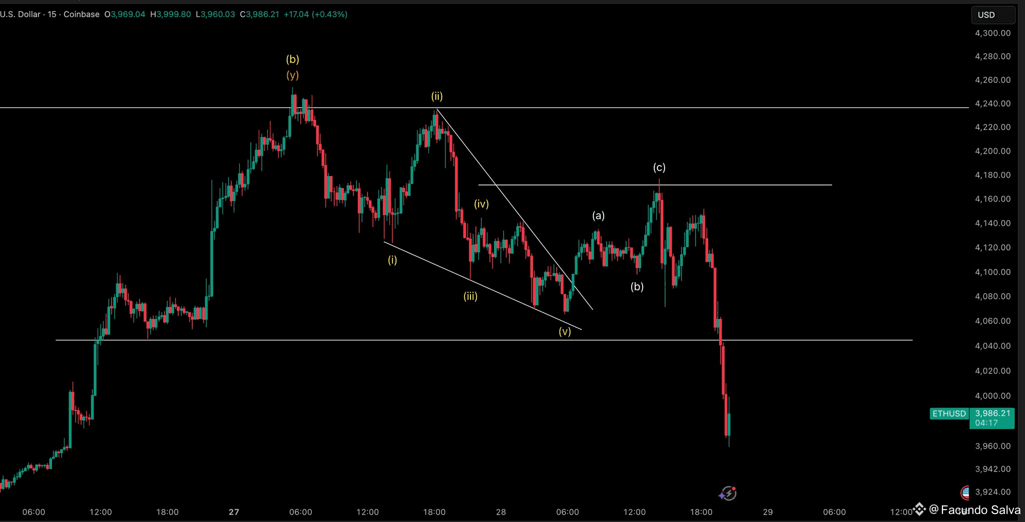 Miren este gráfico de ETH/USD en 15 minutos. Lo que ven es la pura sangre del mercado. Después de que Ethereum (ETH) tocara un pico por encima de los $4,240 (ese pico marcado como (b)), el precio hizo una figura de corrección brutal. Primero, parece que intentó formar un patrón de triángulo o una onda expansiva (i) a (v), donde el precio se fue contrayendo, buscando soporte, pero falló. Luego intentó un rebote en un patrón (a)-(b)-(c), tratando de recuperar terreno, ¡pero se estampó! La línea superior de resistencia cerca de los $4,175 aguantó, y después de esa onda (c), la caída fue libre y sin paracaídas. 📉