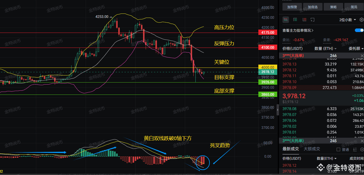 弱势反弹就是诱多陷阱! 比如上个月ETH从4200跌到3800那次,死叉出现后盲目抄底的散户,几乎全被埋在山腰。