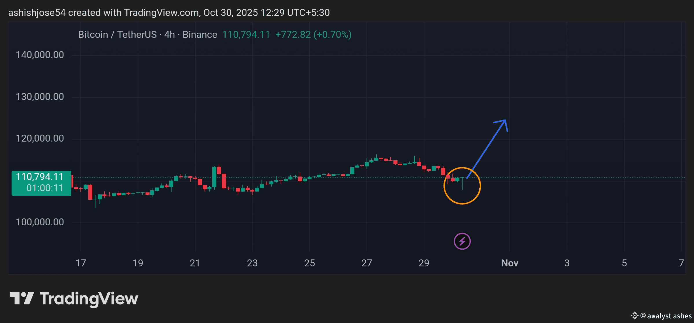 The last candle on the Bitcoin/USDT 4-hour chart shows a reversal or bullish signal after a short-term drop, indicated by a strong wick and a close above the previous levels, which often suggests buyers have stepped in to defend support