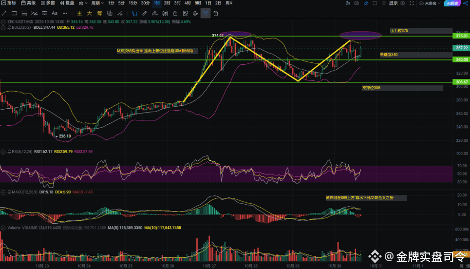 盯着一小时 K 线图就懂了:ZEC 刚站上 340,转眼又摸到了 M 顶的顶端!上次就是碰顶后直接回调,这次会重蹈覆辙,还是能一口气破位冲高?更让人揪心的是 MACD—— 水上死叉刚转金叉,看着是利好,实则藏着大猫腻!