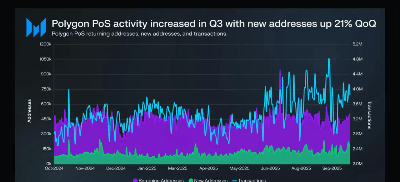 在一个网络的生命中,有些时刻数据和氛围开始对齐。数字可以自我运行,但当情感与其一同转变时,发生了更深层次的事情。2025年第三季度对于Polygon来说,感觉就是这样的一个时刻。数字很强劲,但突出的却是活动的语气。增长并未感觉被迫。它并不感觉投机。它感觉是生活过的。人们使用这个网络是因为它对他们有效,而不是因为他们想从中提取什么。