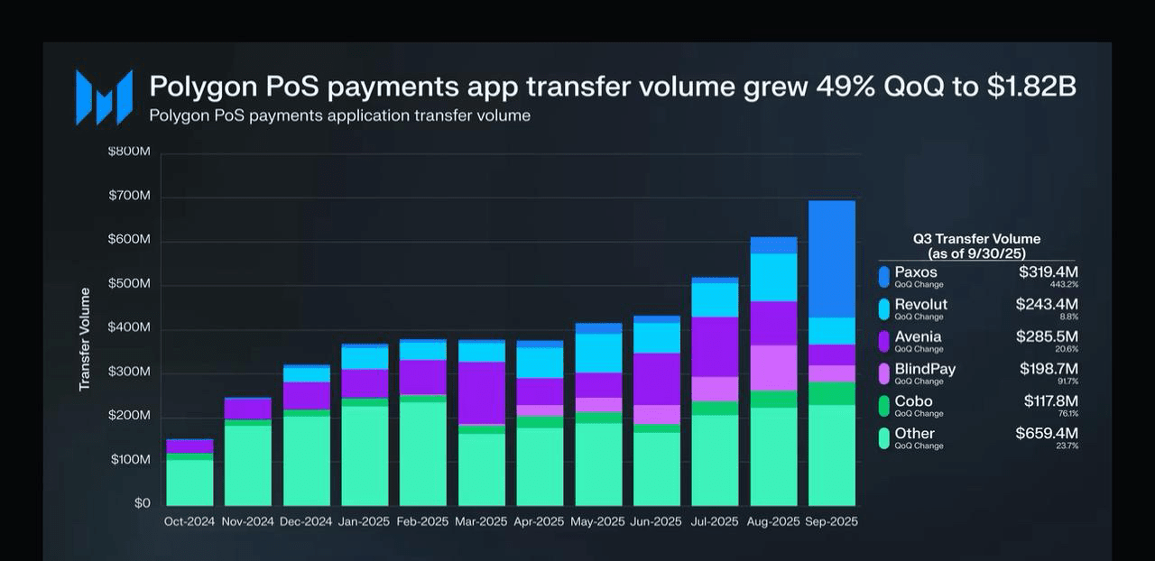 现实世界资产的代币化使这一点更加清晰。Polygon PoS上的RWA总价值在本季度达到了11.4亿美元。这些发行来自公共金融机构、受监管的资产框架和政府部门。这些组织不会轻易进行实验。他们缓慢承诺,并且承诺持久。一旦资产在链上创建和管理,它们很少回到之前的环境。链上发行是一种架构决策。它表明信任已经转移。