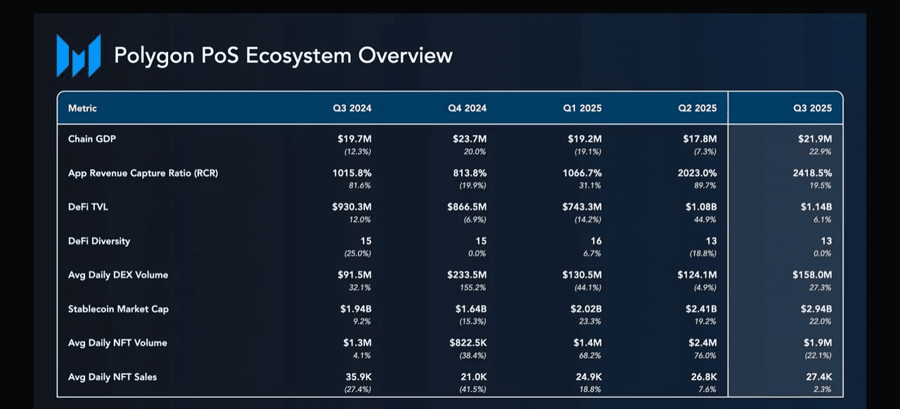 POL的流通市值本季度增长了39.2%,达到了23.6亿美元。可以将其描述为相对于更广泛的加密市场20.7%增长的超额表现,但更重要的细节是这种增长的感受。它并没有感觉像是在追逐叙事的激增。它感觉像是资本重新定位于看似持久的方向。Polygon看起来不再像是在下一阶段实验的赌注,而更像是对一致性的赌注。