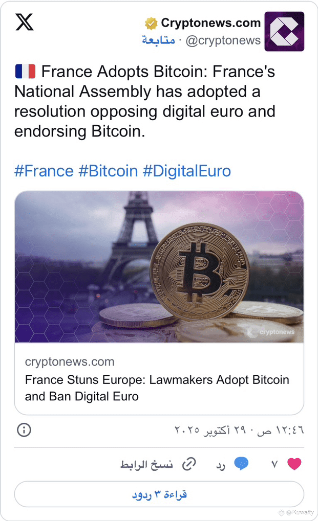 كما حذر المشرّعون الفرنسيون من أن العملة الرقمية المركزية قد تُهدد الخصوصية والحرية المالية، داعين بدلاً من ذلك إلى إستراتيجيةٍ وطنيةٍ لتجميع احتياطياتٍ من عملة بيتكوين (Bitcoin).
