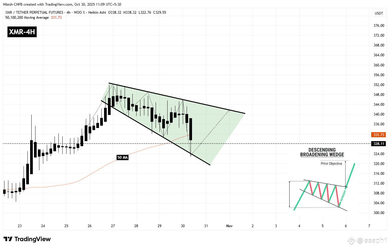 Aquí viene lo interesante del análisis técnico, ¡pongan ojo! Monero se metió en lo que llamamos una "cuña descendente en expansión". Imaginen un embudo que se va abriendo, pero que, en el análisis técnico, es como una señal de ¡alerta de cambio! Esta figura suele ser un indicador de reversión alcista; es decir, la volatilidad aumenta, los vendedores se cansan y se abre la puerta para que los compradores retomen el control y empujen el precio hacia arriba. 📈