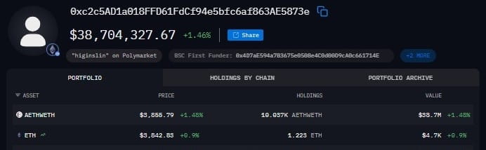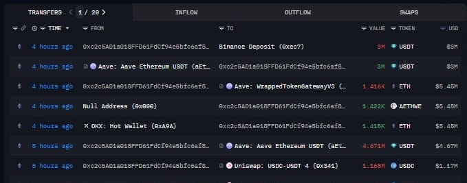 四小时前,钱包 0xc2c5AD1a018FFD61FdCf94e5bfc6af863AE5873e 提取了 1,415 $ETH (约 $5.45M) 从 OKX,增加了一个已经很重的包裹。自9月26日以来,该地址一直在稳步累积,现在持有 10,037 ETH(价值约 $38.7M)。