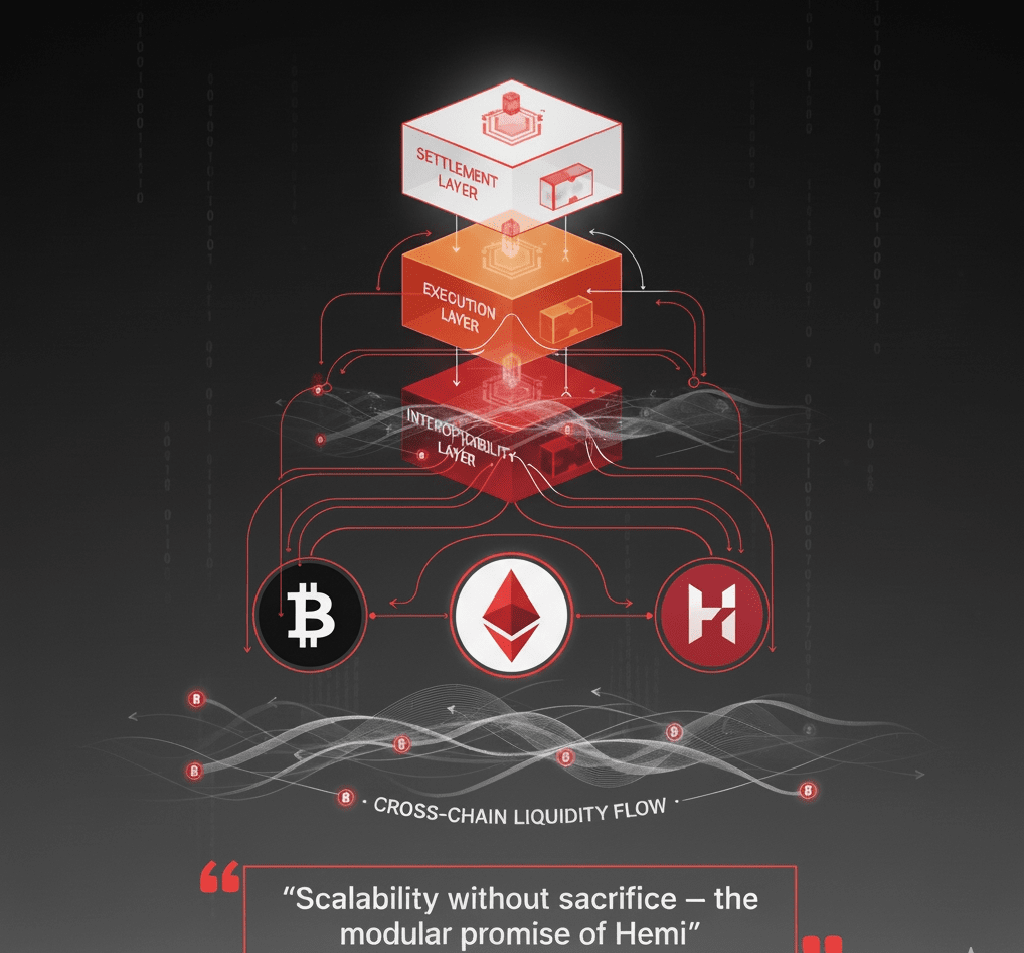 Hemi 的基础是通过模组专业化运作。它将核心功能划分为不同但相互连接的层——执行、结算和互操作性。每个组件扮演著特定的角色:执行层确保高效计算,结算层利用比特币的安全性,而互操作性层维持跨链通信的完整性。与单链网络不同,@Hemi 的层可以独立演变,确保可持续的可扩展性而不妥协结构。将结算证明锚定到比特币上增强了验证透明度,而兼容以太坊的执行层扩大了开发者的可接触性。这些元素共同创造了一个动态的 Layer-2 网络,支持高容量活动而不牺牲去中心化。该设计优先考虑灵活性和韧性,允许升级、新模组和协议扩展无缝集成。实质上,Hemi 将模组化从一个概念转变为一个随著生态系统本身扩展的适应性框架。