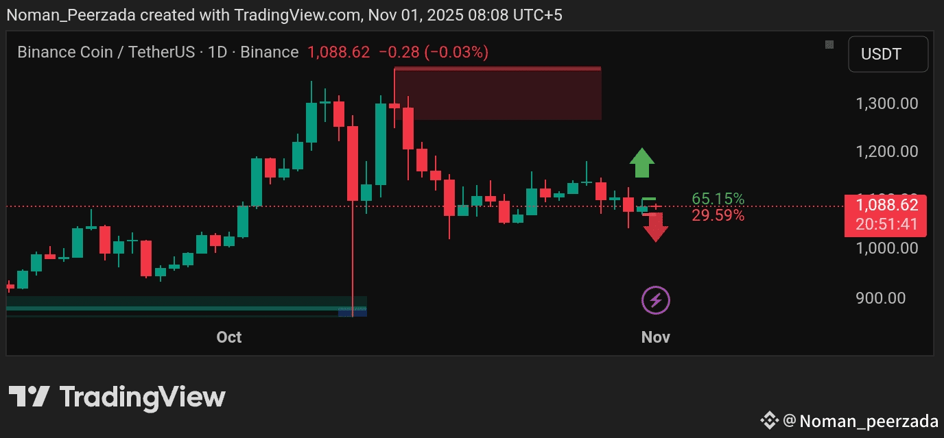 1 November 2025 tak, BNB takreeban $1,088 par trade kar raha hai pichle 24 ghanton mein 2% ki girawat ke bawajood yeh abhi bhi $1,000 ke psychological level ke upar stable hai. Is saal ke shuruaat mein BNB ne apna previous all-time high $690 tod kar ek nayi structural uptrend start ki thi, jiss ne ab ise four-figure zone mein la khada kiya hai.