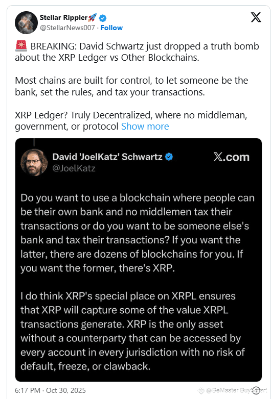In his post, Stellar Rippler described Schwartz’s remarks as a “truth bomb” about how the XRP Ledger (XRPL) differs from other networks, emphasizing that most blockchains are designed for control, while the XRPL was built for freedom, with XRP at the center of the system.