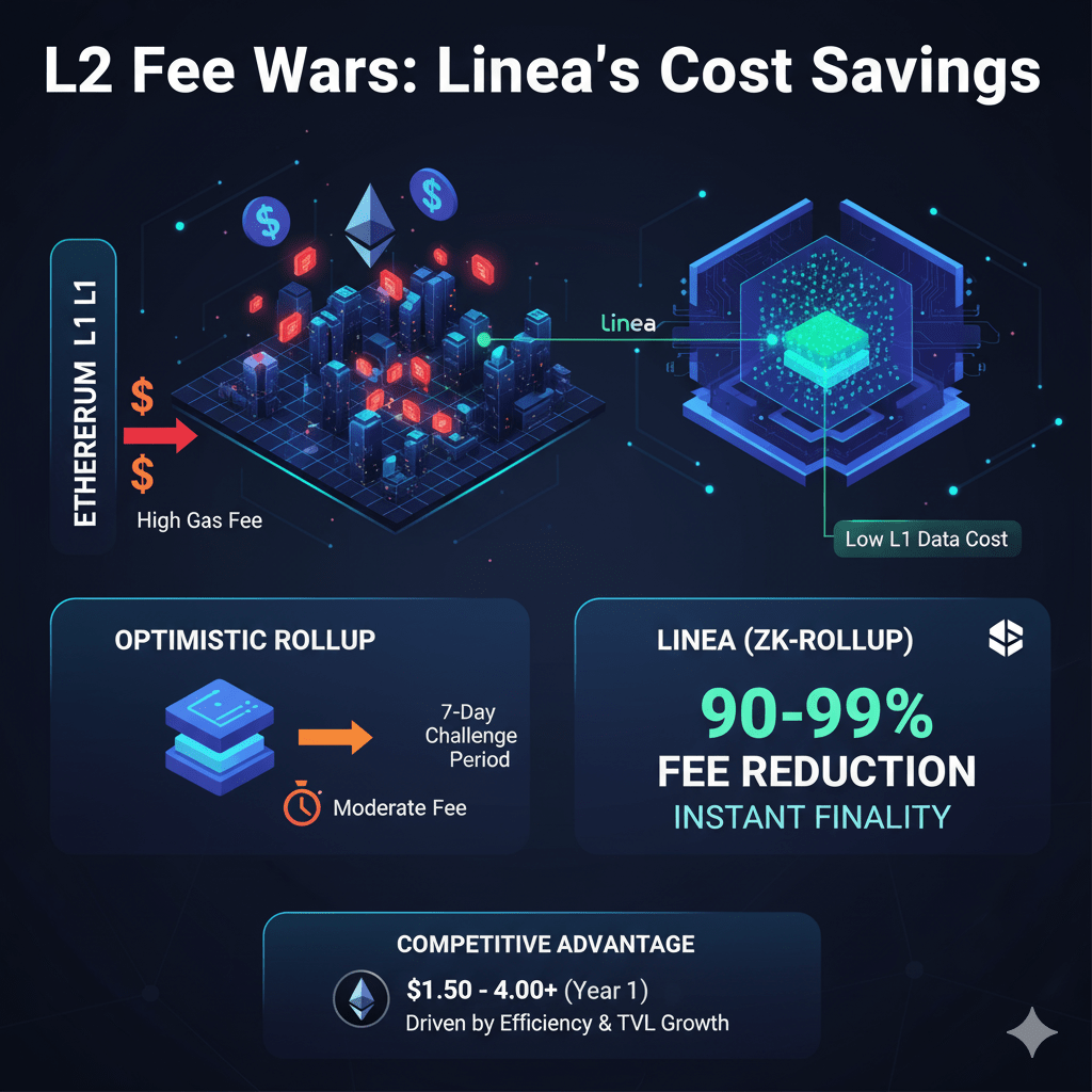 2. 费用结构:用户为 ZK 证明支付最低的 L2 执行费用和部分 L1 发布成本。由于 Linea 的压缩效率极高,整体费用通常比直接的 L1 交易低 90%–99%。