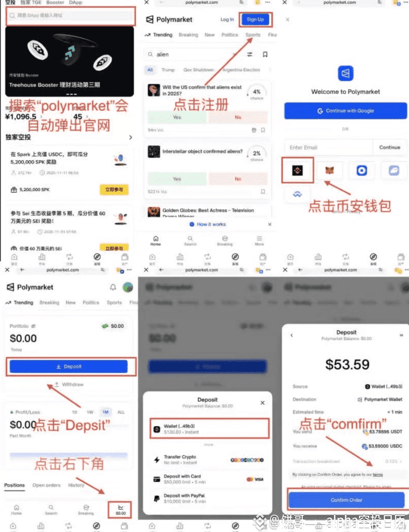 1️⃣提前准备好#Polygon 链上的usdc,@Polygon 速度快只要七分钱$POL 手续费,其他链转账需要先进行兑换,有磨损。币安自带浏览器浏览器搜索 Polymarket,会自动弹出官网(安全简单)