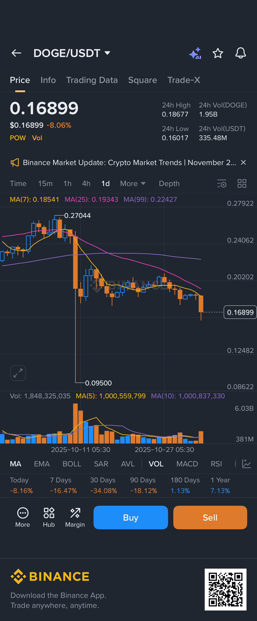 DOGE 在从 $0.27 阻力区被拒绝后经历了急剧的修正。从 $0.27 → $0.095 的长阴烛在十月份捕捉到高波动性和投机交易。