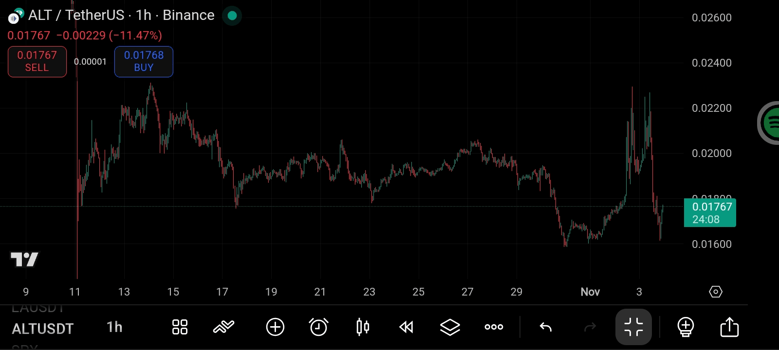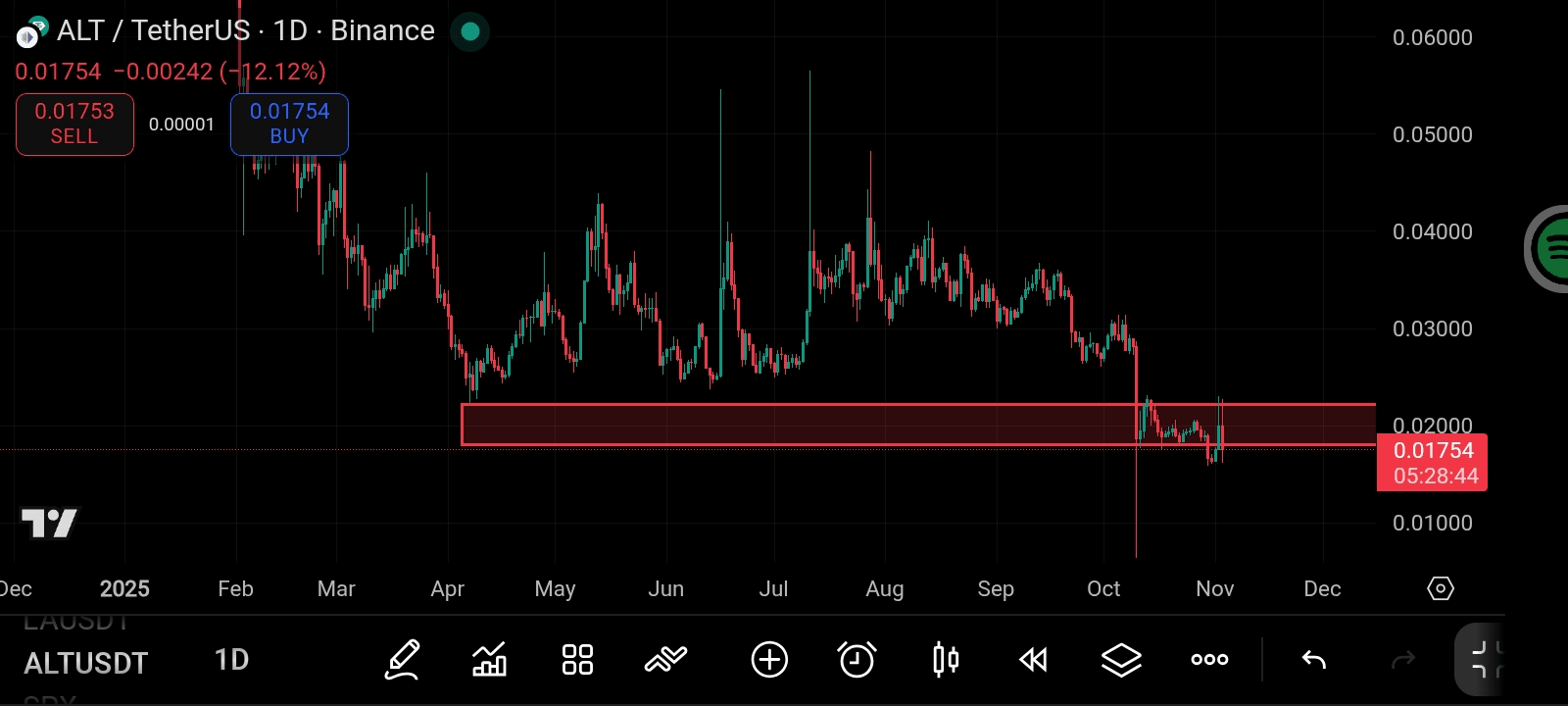 $ALT 在经历了一次几乎回撤整个第二季度结构的深度修正腿后,已返回其长期需求区间。日线图显示,年中高点的流动性已系统性地回流到之前作为强反应点的 $0.016–$0.020 之间的同一积累区。这一区域再次定义了长期持有者与短期投机者之间的战场。