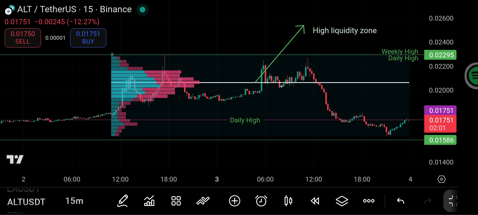 可视范围配置文件显示在$0.0175–$0.019之间有大量集中,形成了最近交易发生的控制点。这告诉我们两件事: