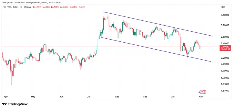 Glassnode 图表显示「按年龄计算的花费量」明显上升,确认较旧的币种正在被转移——这通常是实现利润的迹象。这股长期持有者活动的激增与 XRP 在其日线图上形成较低的高点和较低的低点相吻合,勾勒出反映动能减弱的下降模式。
