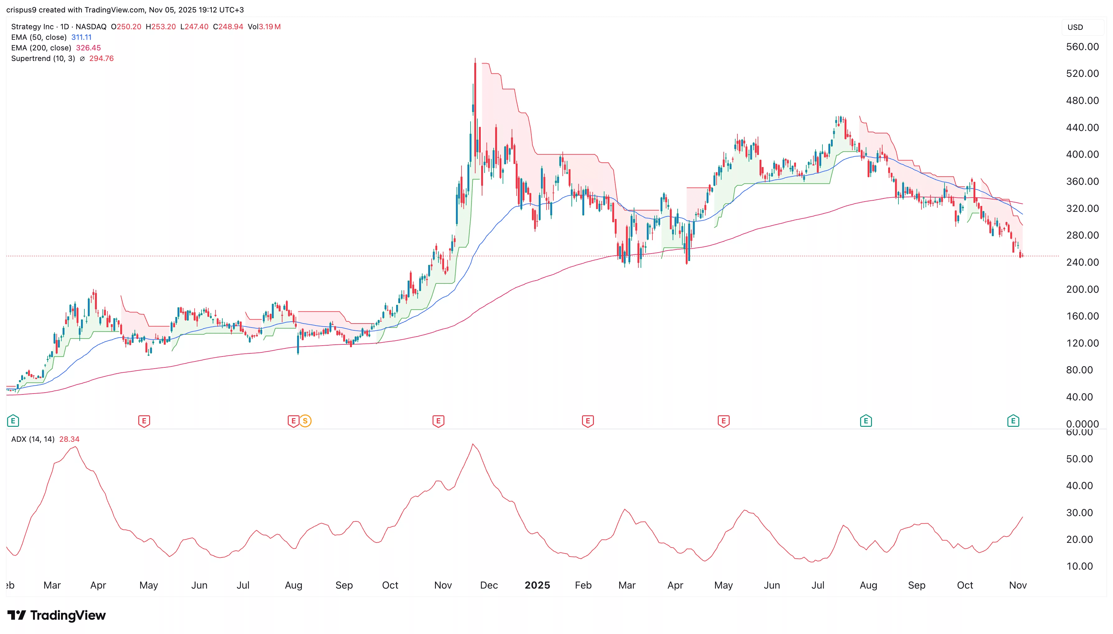 从技术角度来看,MSTR的图表显示出持续疲弱的迹象。