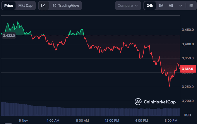 截至撰写时,以太坊的交易价格约为 3,312 美元,显示在过去 24 小时内下降了 3.48%。