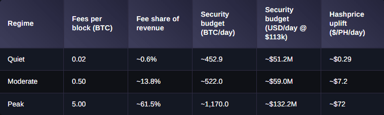 使用每天144个区块、3.125 BTC的补贴、网络哈希率接近1.13×10⁹ TH/s,以及现货价格约为$113,000,每个区块的费用为0.02 BTC、0.50 BTC和5.00 BTC,分别对应于矿工收入的约0.6%、13.8%和61.5%的费用份额。