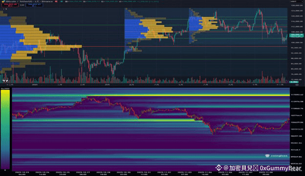 $BTC價格隨著美國政府即將結束關門的利好,價格回升到$106,000左右,短期來看價格可能會在$102,000~$112,000區間波動,如果有足夠的利好事件,價格可能會向上測試一下$116,000~$118,000附近的空頭密集清算區。向下的話目前算是踩穩$102,000的價格支撐,除非又有什麼超乎市場預期的事情,不然短期應該不會再去測試$96,000的支撐位。
