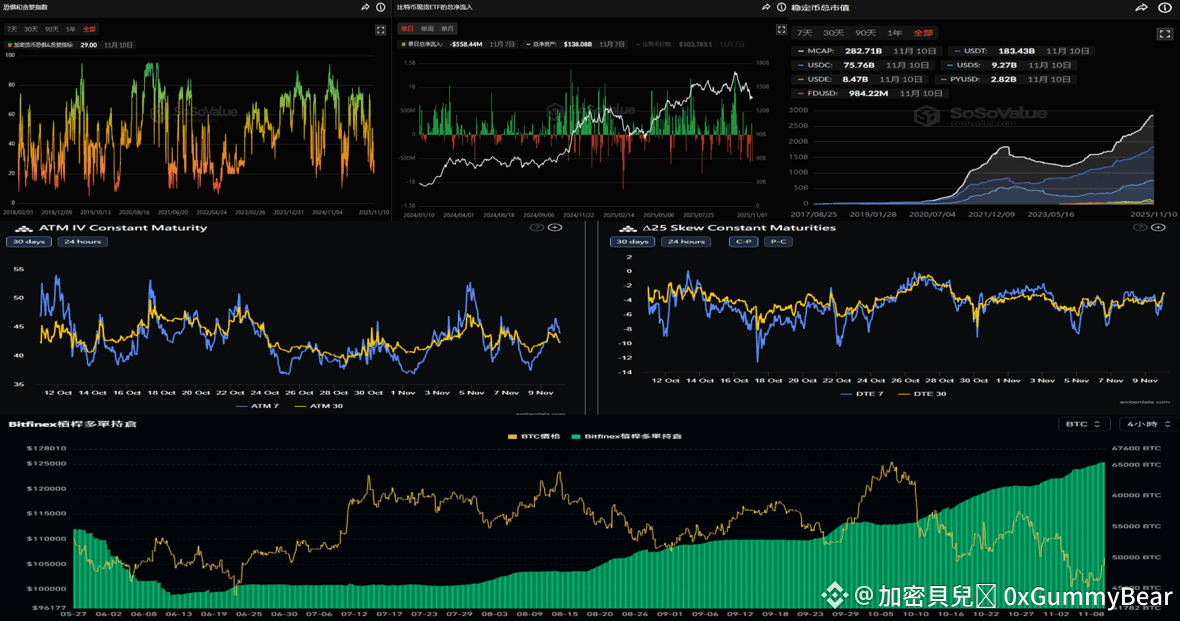 Sosovalue數據顯示目前恐懼貪婪指數偏向恐懼。穩定幣市值依然保持增長,$BTC ETF資金流入量大大減緩。期權波動率略微增加,∆25 Skew數據略微看跌,綠葉多單槓桿則保持顯著增加。