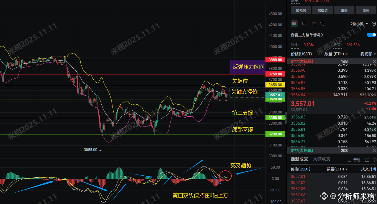 从一小时K线图来看,ETH现在在3550附近挣扎,MACD白黄线虽然在0轴上方,但已经形成死叉趋势,这说明短期动能转弱,空头可能占上风。