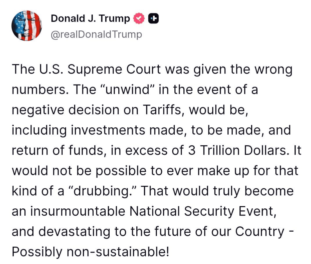 唐纳德·特朗普刚刚发布了一条震动全球交易者的真相社交帖子:他声称最高法院的关税数字是错误的——如果情况逆转,可能会出现“3万亿美元的解除”。😳