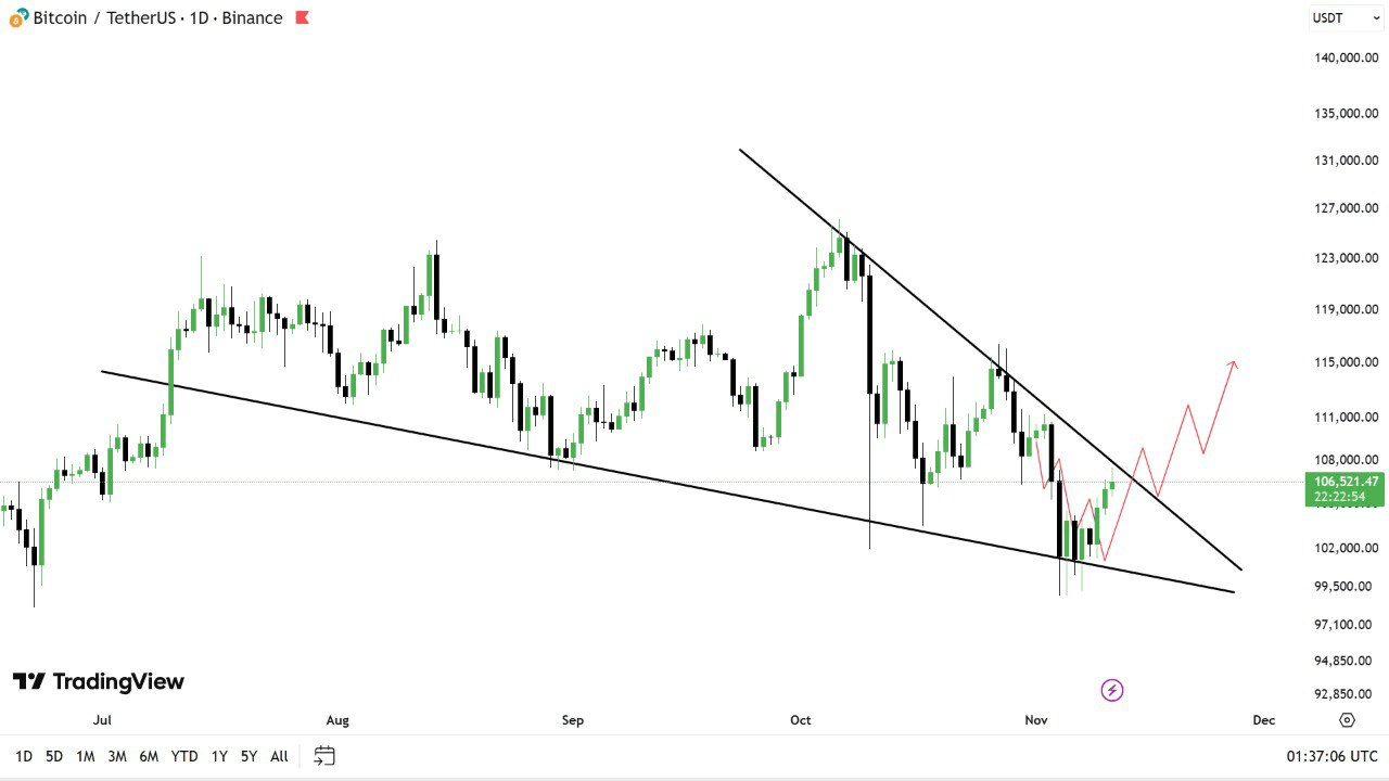 BTC正在日线时间框架中形成下跌📈楔形模式,看起来很看涨🦬。