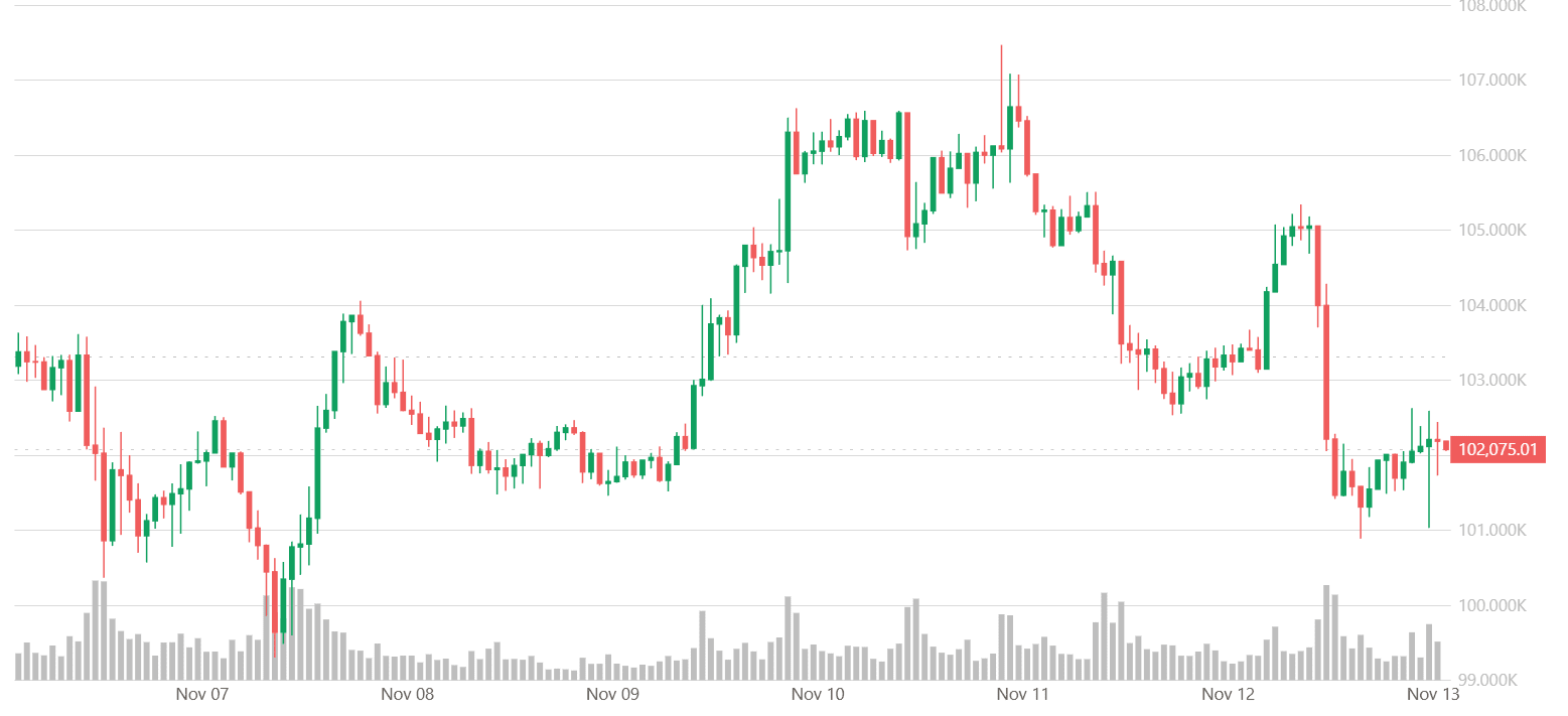 交易开始时,BTC曾尝试挑战 105,050 美元附近阻力,但在11月12日 UTC 时间下午 4 点前,走势明显转弱,连续出现更低的高点。最后 8 小时,价格在 101,500–102,200 美元窄区间震荡,随着成交量萎缩,卖压有所缓和。