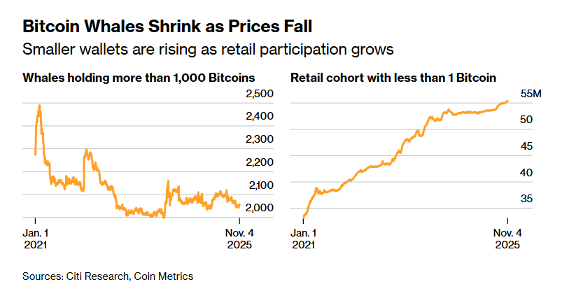 他指出钱包行为发生了变化。花旗分析显示,持有 超过 1,000 BTC 的“鲸鱼钱包”数量正在下降,相反,持有少于 1 BTC 的散户钱包数量在增加。