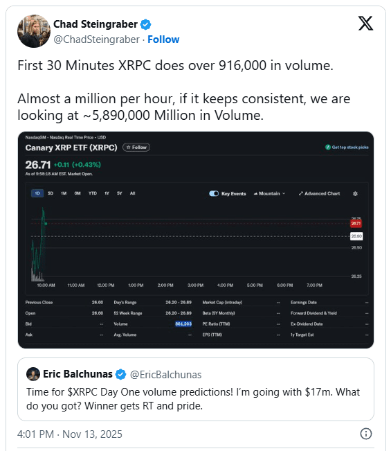 $XRP Canary Capital现货XRP ETF (XRPC) 今天开始交易,并在首30分钟内以惊人的表现震撼了交易者。他报告说,该基金在开盘半小时内的交易量已经超过916,000美元。