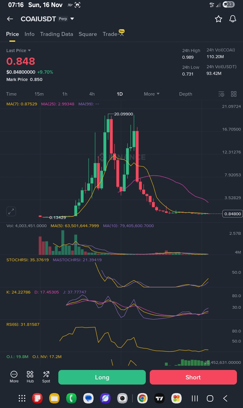 显示的 $COAI 图表显示出显著的历史拉升,随后是急剧下降,目前价格在$0.85附近整固。