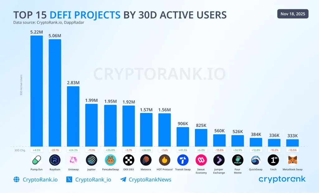 Jumper Exchange 吸引了 560,000 名用户,增长了 13.8%,而 Four Meme 的用户数量达到了 526,000,增长了 36.9%。QuickSwap 注册了 384,000 名用户,增长率为 12.8%,1inch 报告了 336,000 名用户,下降了 15.2%,而 MetaMask Swap 以 333,000 名用户结束了名单,下降了 13.5%。