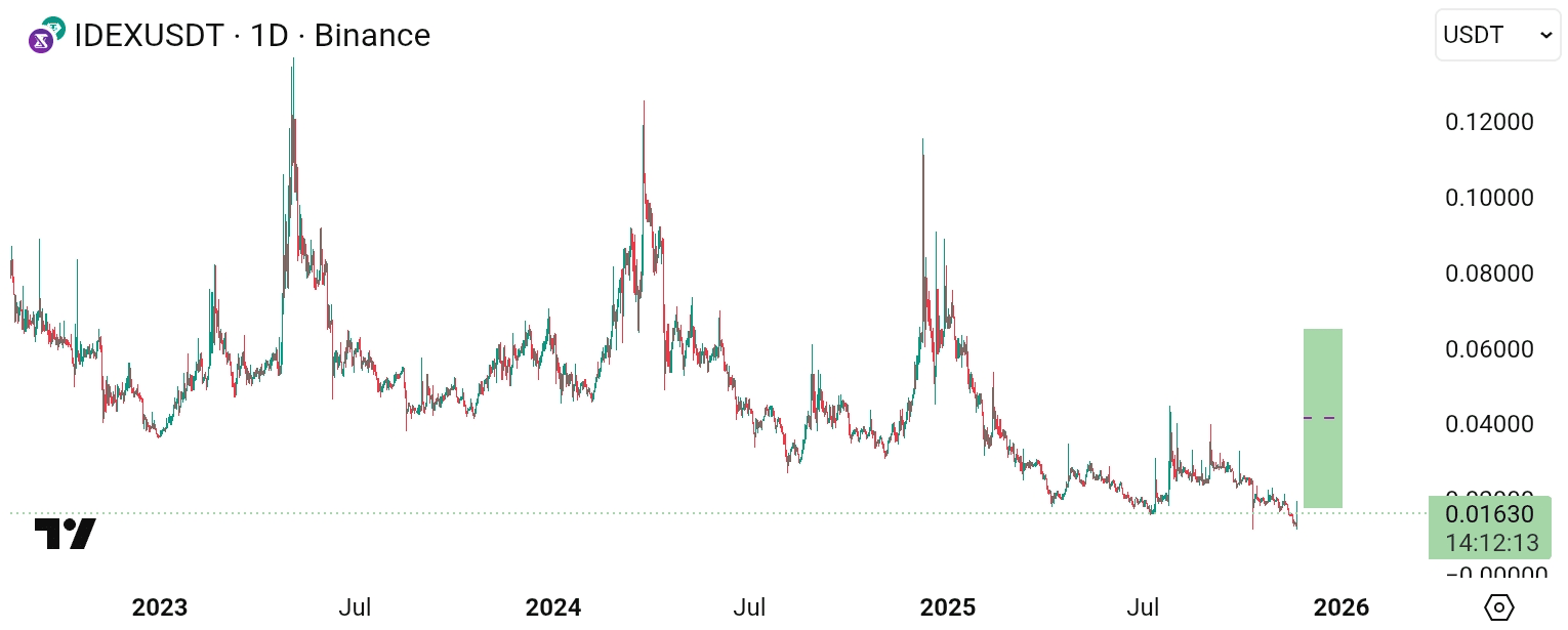 每年 $IDEX 都会带来一次巨大的 10 倍突破 📈 — 而现在,它正处于日线时间框架上一个大型三角形 📐 形态的绝对底部,坐落在接近 0.01630 USDT 🧠 的关键支撑位。