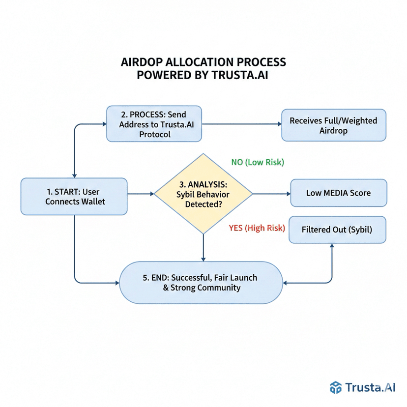 视觉化 Trusta.AI 效果:这个流程显示一个项目如何自动且公平地过滤用户,确保奖励给予真实贡献者,而非 Sybil 攻击者。
