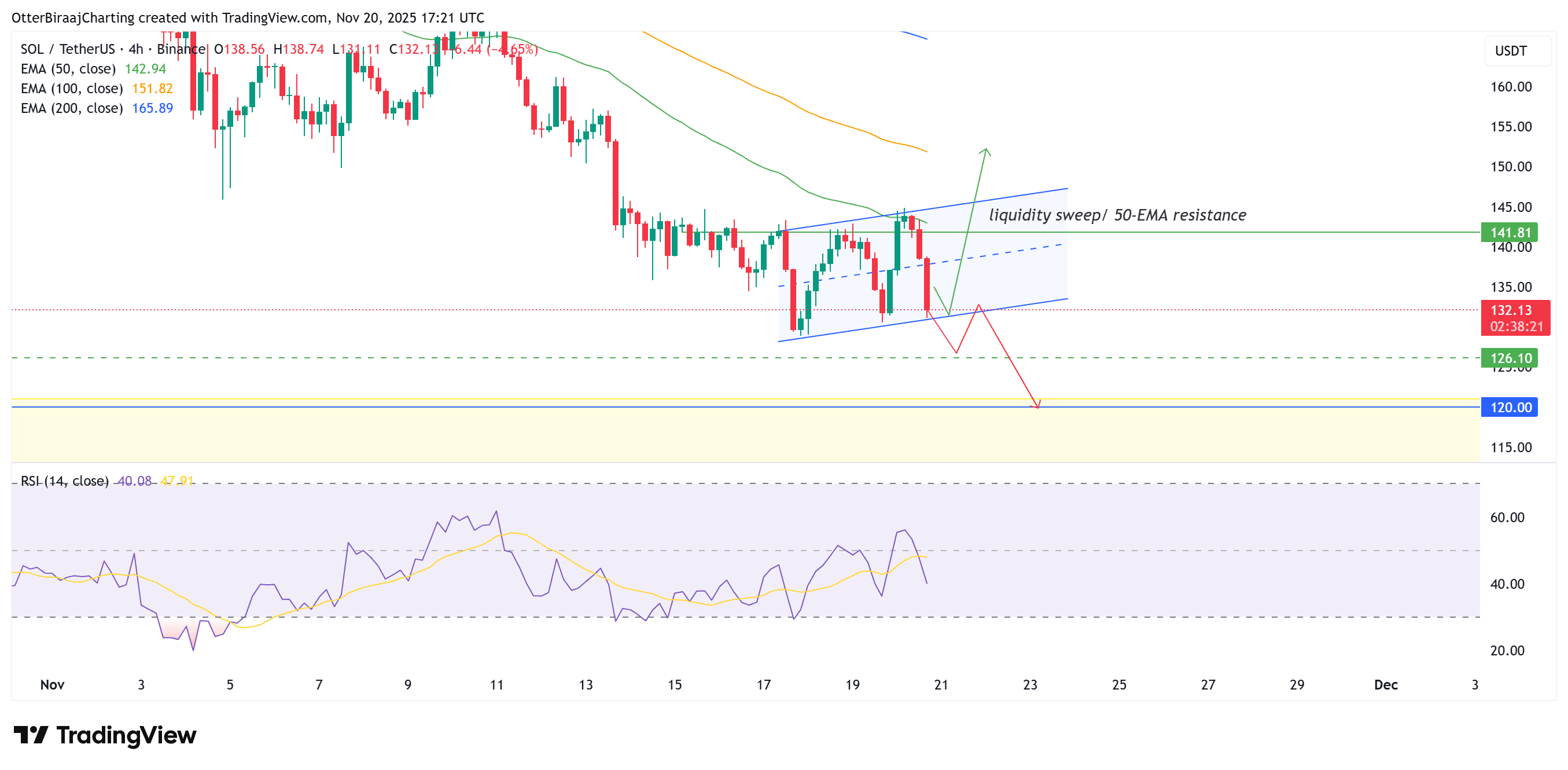 11月20日,Solana短暂超越了Bitcoin、Ethereum和XRP,在小时图和四小时图上形成了更高的高点和更高的低点。然而,它的反弹很快被50日EMA的强大阻力所抑制,价格回落至132美元。