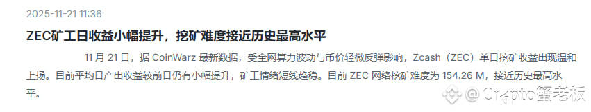 表面看,ZEC矿工日收益小幅提升是利好,但结合154.26M的历史级挖矿难度,真相令人胆寒:矿工实际收益正被极致压缩。