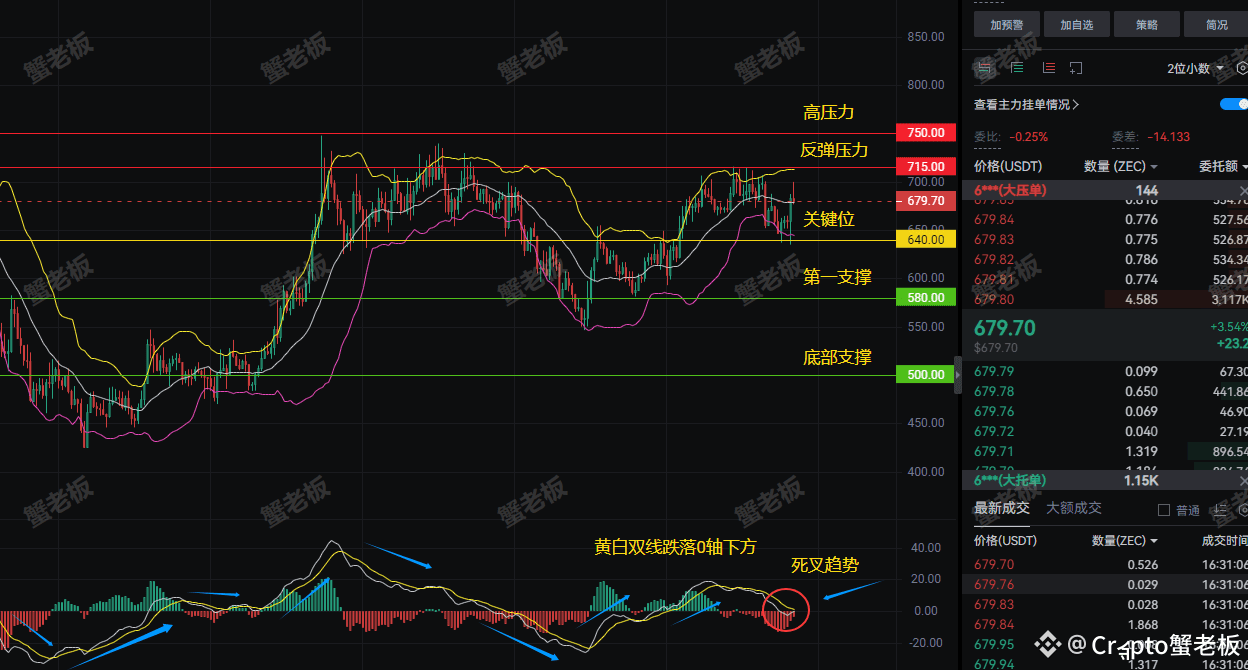640关键位确认失守后,ZEC正式进入空头格局。MACD黄白线不仅下穿0轴形成死叉,更出现“瀑布式”发散形态,这是加速下跌的经典信号。