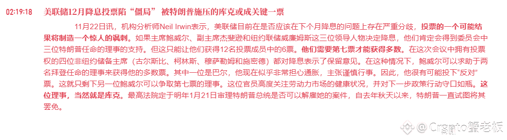 最新获得的内部消息显示,美联储12月降息投票陷入史无前例的"四方博弈"僵局。特朗普派系力推降息,四位地区联储主席联手反对,而被特朗普持续施压的理事库克意外成为"最终裁决者"!