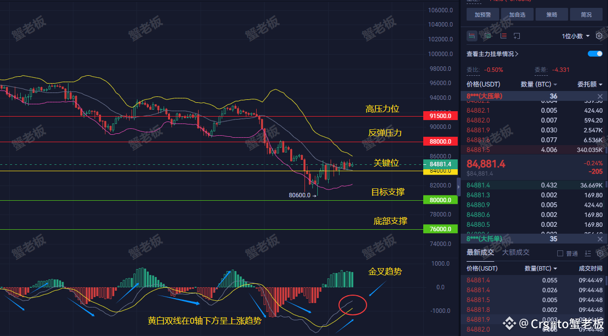 专业图表分析显示,BTC在84000关键位构筑三重底支撑,MACD在0轴下方形成教科书级的金叉信号。