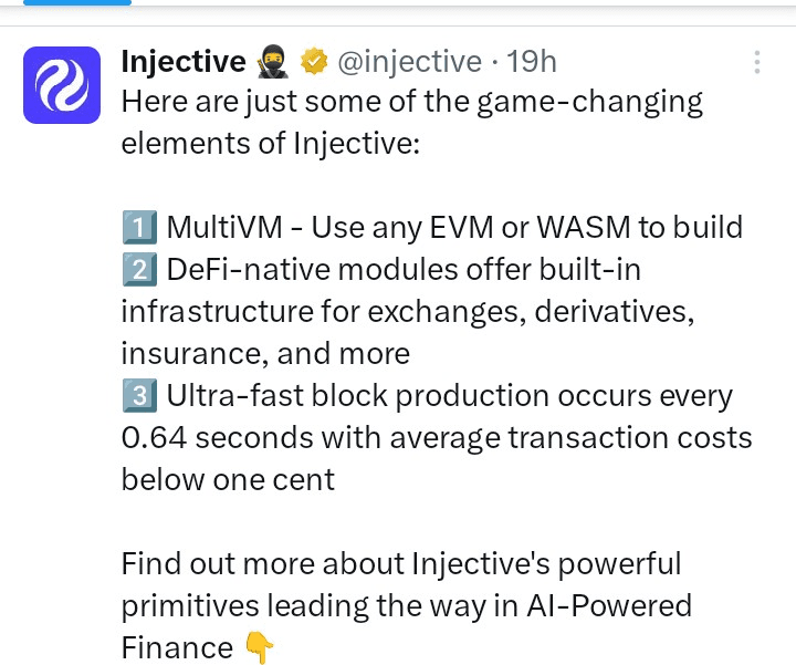 简单来说:Injective就像一台高速、金融优化的机器。定制引擎、模块化机身、Cosmos原生通信,以及闪电般的最终确定性。不是另一条试图成为万能的通用链。这是一条专为交易、扩展和连接而构建的链。