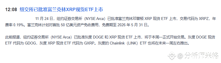 纽交所同时批准富兰克林邓普顿和灰度的XRP现货ETF,并宣布灰度DOGE ETF同步上市。这不仅是合规性重大突破,更是机构资金入场的高速通道。