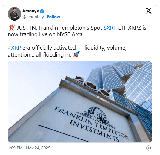 富兰克林 XRP 信托(XRPZ)已正式在 NYSE Arca 上开始交易,头几个小时的表现简直是爆炸性的!