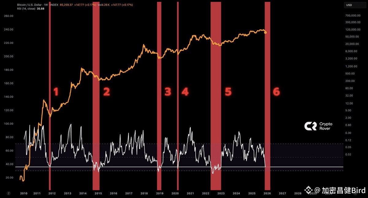 长期比特币的RSI指标也在底部区间,这种低位历史上只出现过六次,前五次都是在筑底阶段。