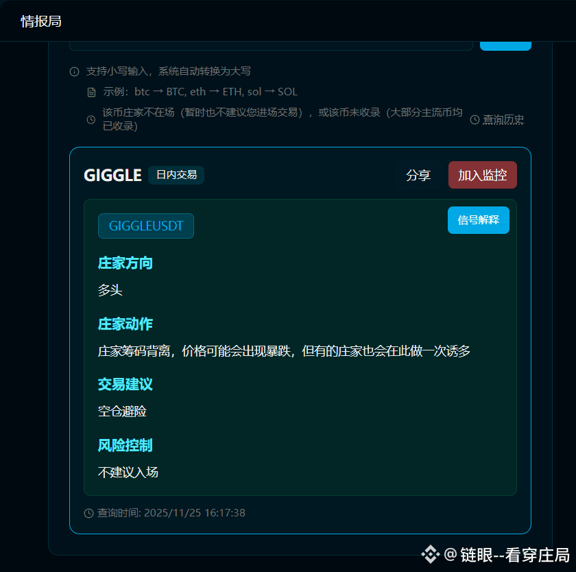 兄弟们,先理清楚当前盘口逻辑:行情处于主力筹码背离阶段,情报局监控明确提示 “庄家筹码背离 + 诱多风险”;链上看流通筹码 90% 集中在 5 个钱包,控盘度是普通币种的 3 倍。