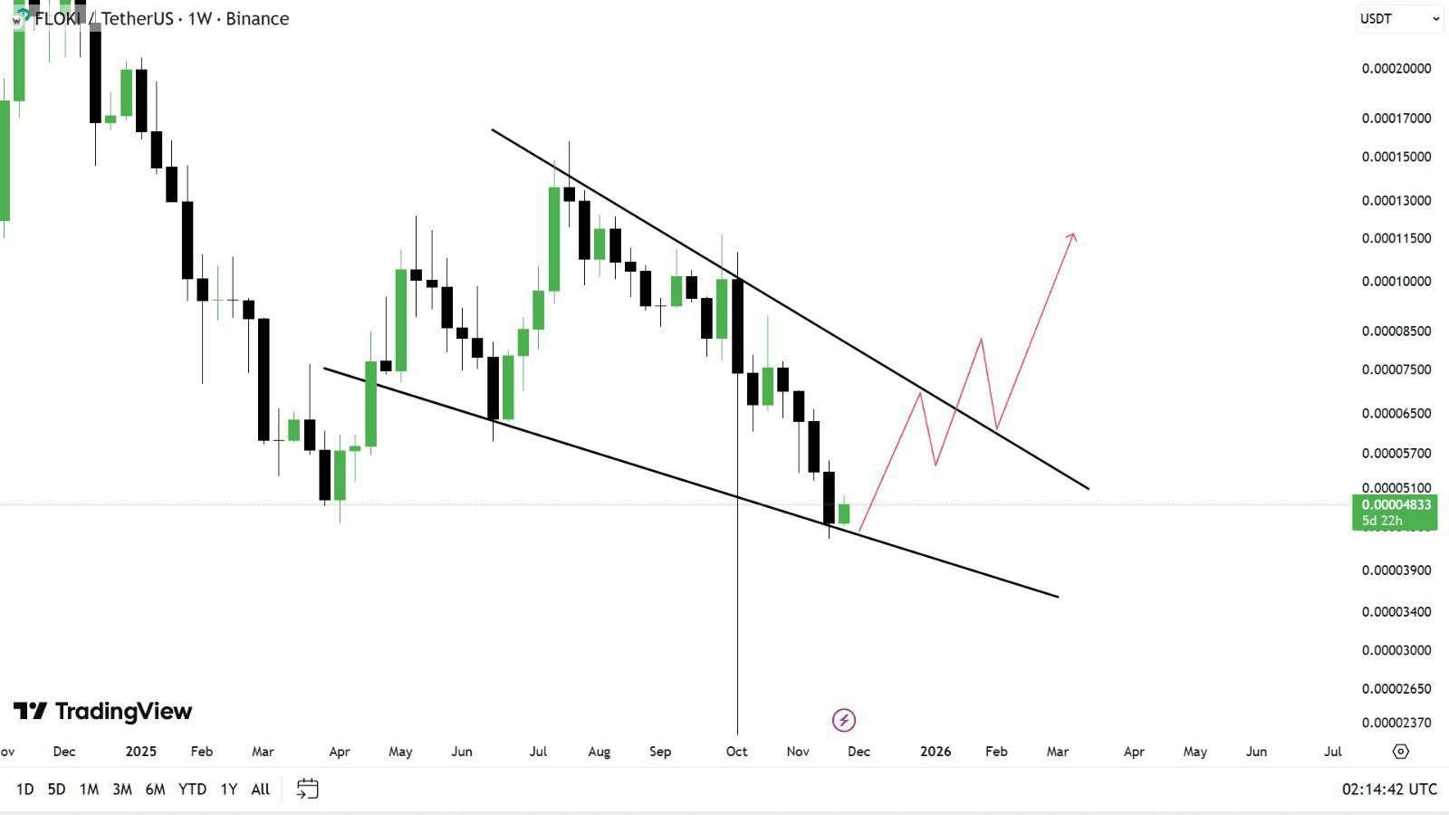 $FLOKI 正在形成一个不错的下降楔形模式📈,在宏观图表中看起来是看涨的🦬,在这个阶段。