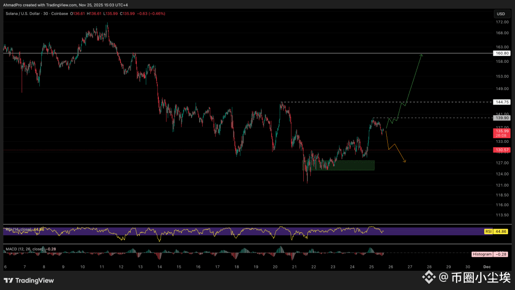 Solana 有一个相当稳固的支撑区,形成在124至127美元之间。那个区域现在是主要的安全网,所以如果SOL降回130以下,可能会在那里重新积累。