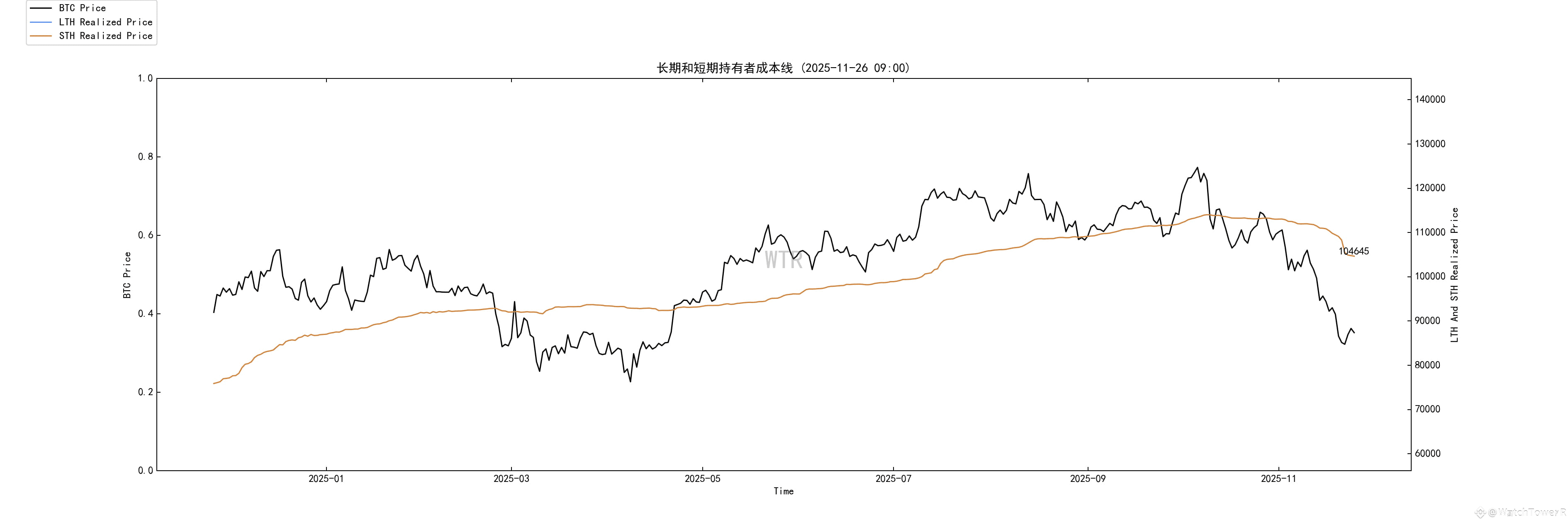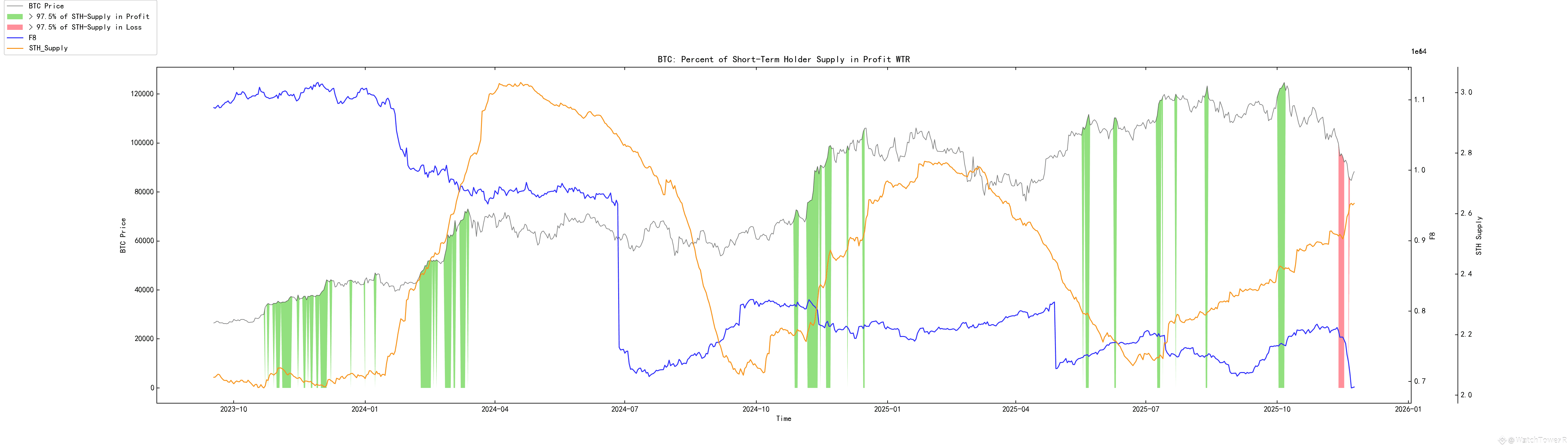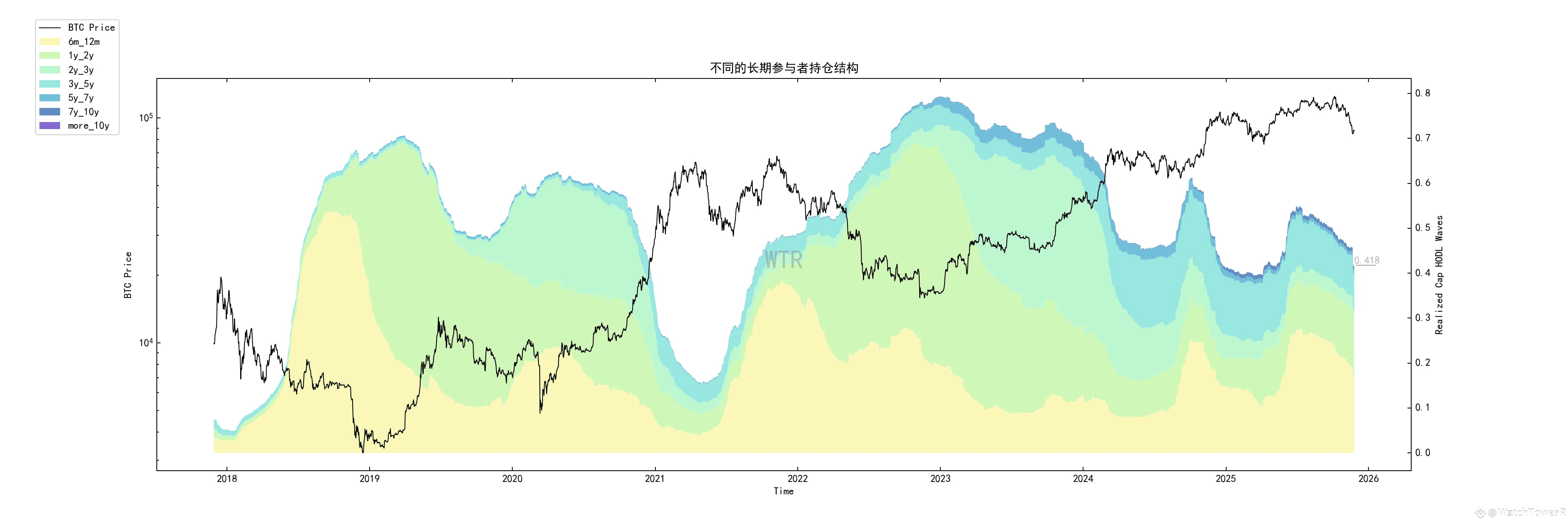 长期持有者整体占比自高位回落,但仍维持在 ~45% 上方,说明长线信仰并未崩塌,更多是周期中后段的理性兑现。