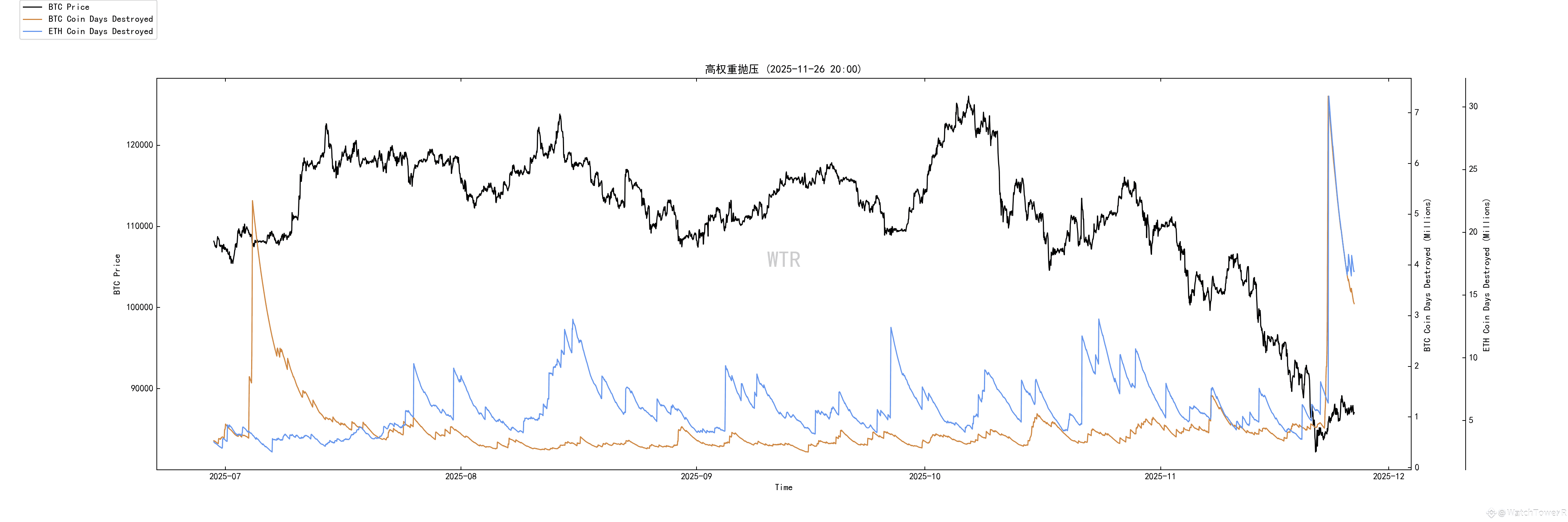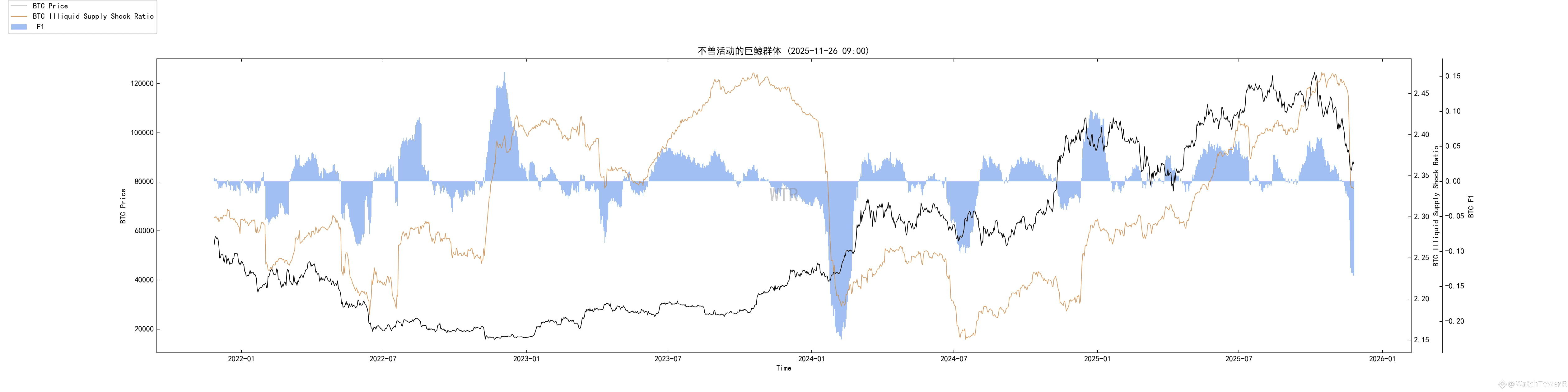 非流动长期巨鲸已经从高位净买入,转为在宏观转差后有序减仓;老筹码在派发,而不是加仓。